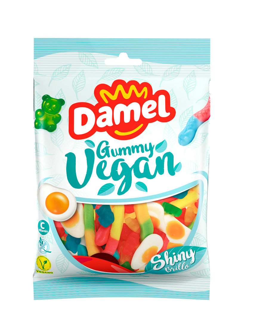 Damels Shiny Mix Vegan gibt es in einer 120-Gramm-Tüte. Eine Tüte gefüllt mit leckeren veganen Gummibonbons in allen möglichen Formen und Geschmacksrichtungen.