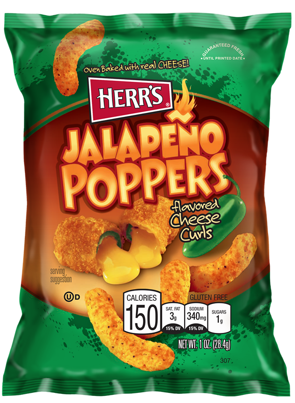 Beißen Sie in diese köstlichen Herr's Jalapeno Cheese Curls. Hinter dem Cheddar-Käse-Geschmack verbirgt sich eine würzige Note von Jalapeno-Pfeffer. Wir haben Sie gewarnt!
