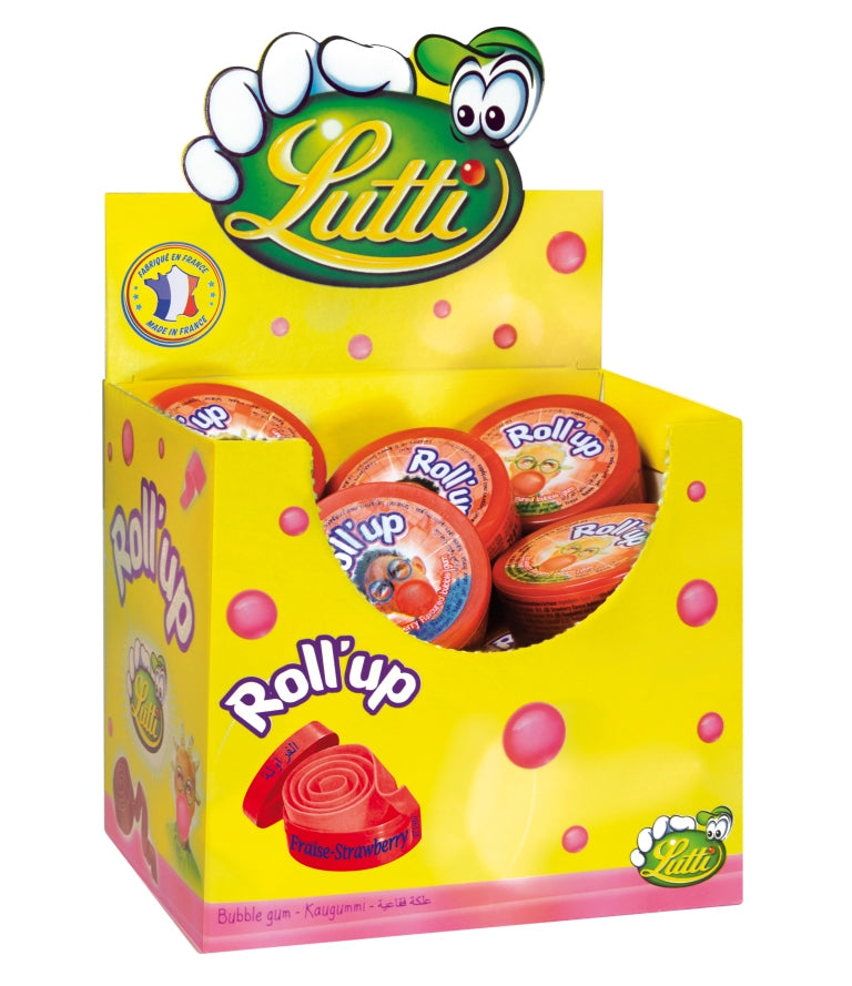 35 Gramm Lutti Tubblegum. Dieser Lutti-Kaugummi zum Aufrollen hat einen köstlichen Erdbeergeschmack.