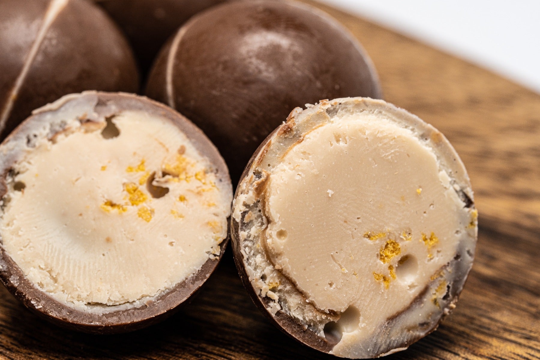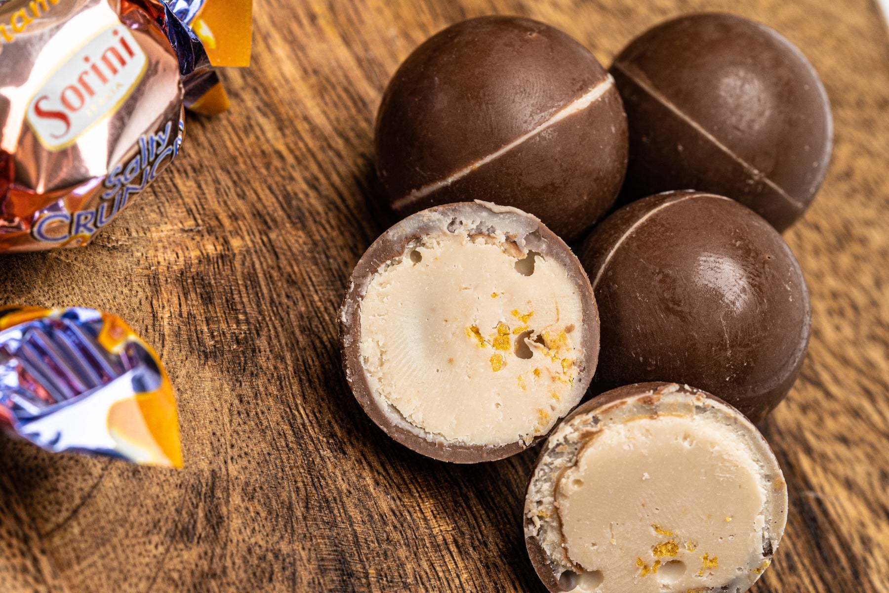 Pralinen aus Milchschokolade mit einer Füllung aus gesalzener Haselnusscreme. Diese 1-Kilo-Packung enthält ca. 65 einzeln verpackte Pralinen.