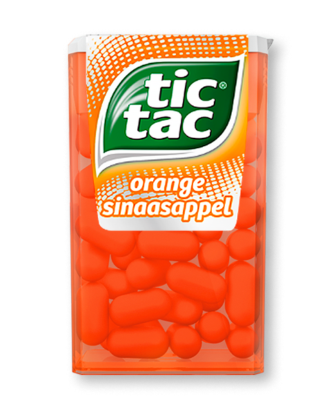 Tic Tac mit Orangengeschmack, verpackt in der bekannten Take-Away-Verpackung.
